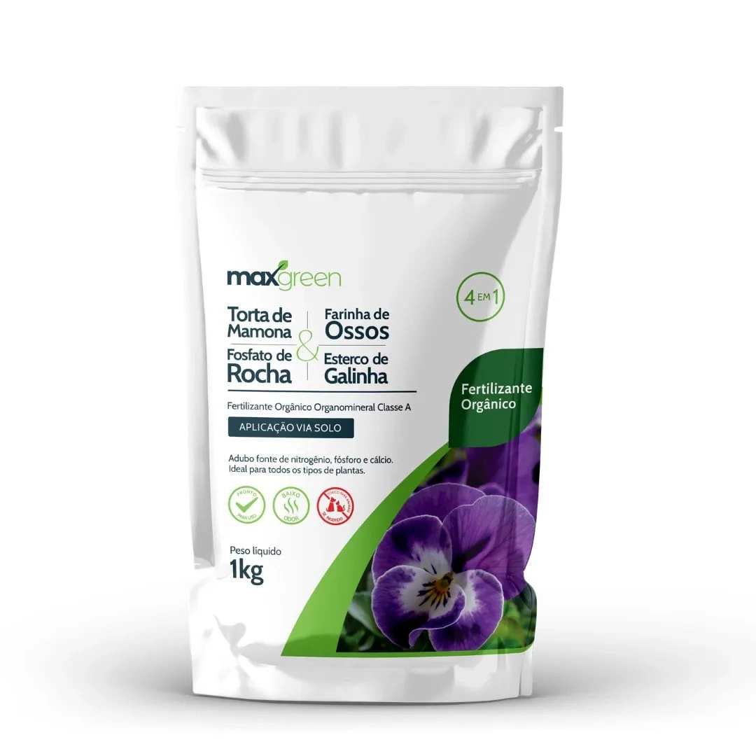 Maxgreen 4 em 1 é um fertilizante orgânico poderoso, feito com Torta de Mamona, Farinha de Ossos, Fosfato de Rocha e Esterco de Galinha. Uma combinação rica em N, P, Ca e Carbono Orgânico, perfeita para fortalecer o solo e garantir plantas mais verdes, fortes e saudáveis.
