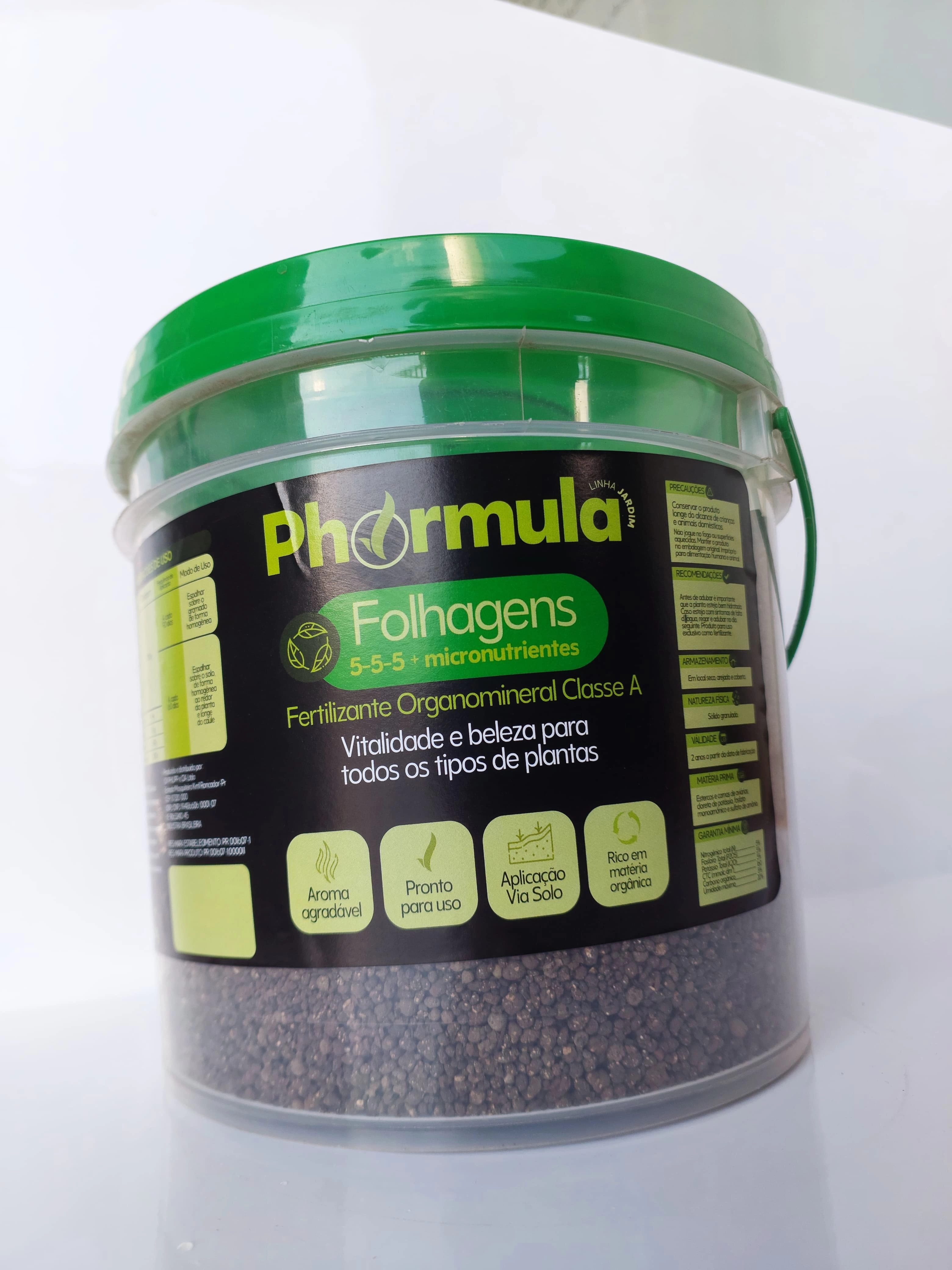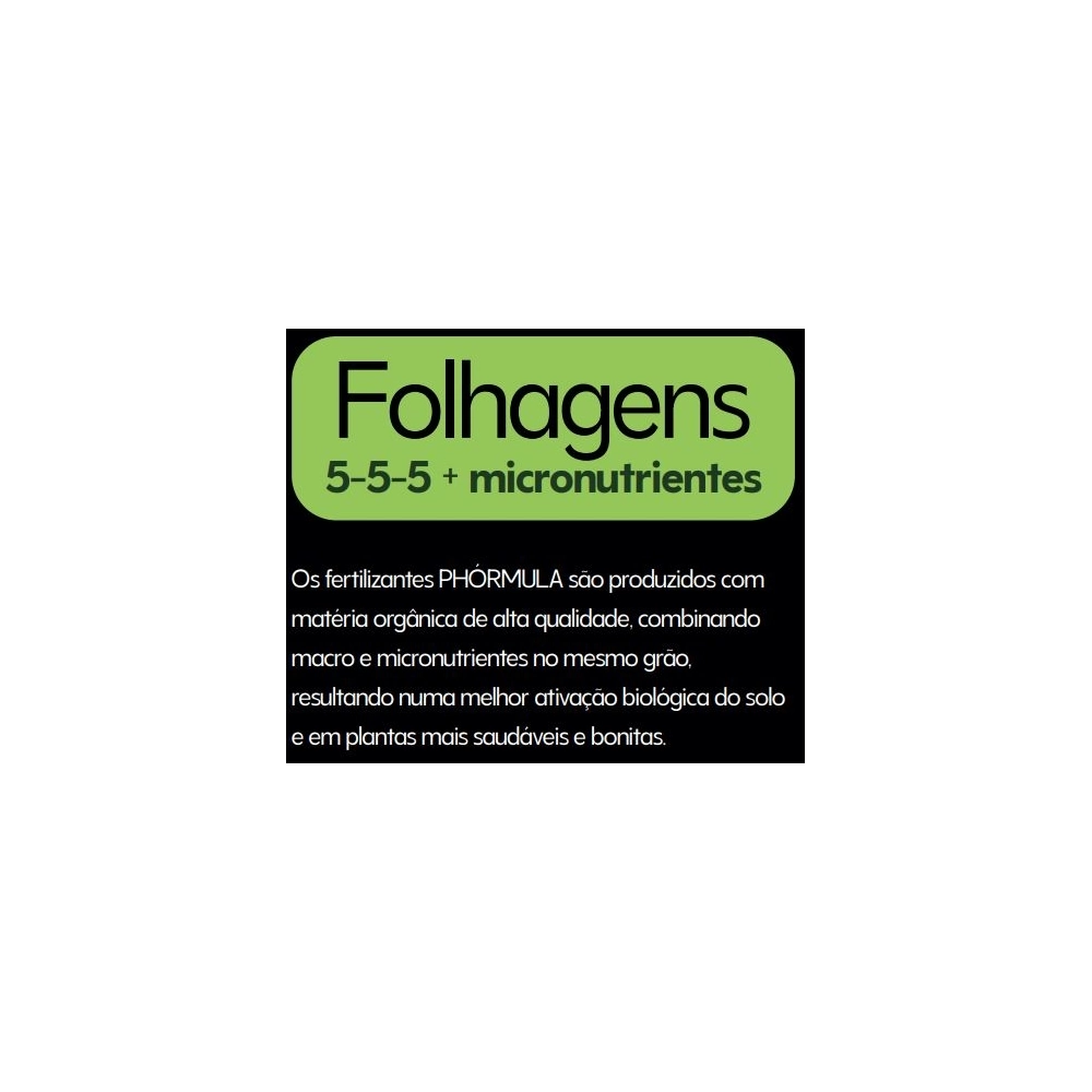 | Modelo | Phórmula Jardim Folhagens 5-5-5 + micronutrientes. Fertilizante Organomineral Classe A. Nutrição completa para folhagens em geral. Ideal para vasos, canteiros e jardineiras. |