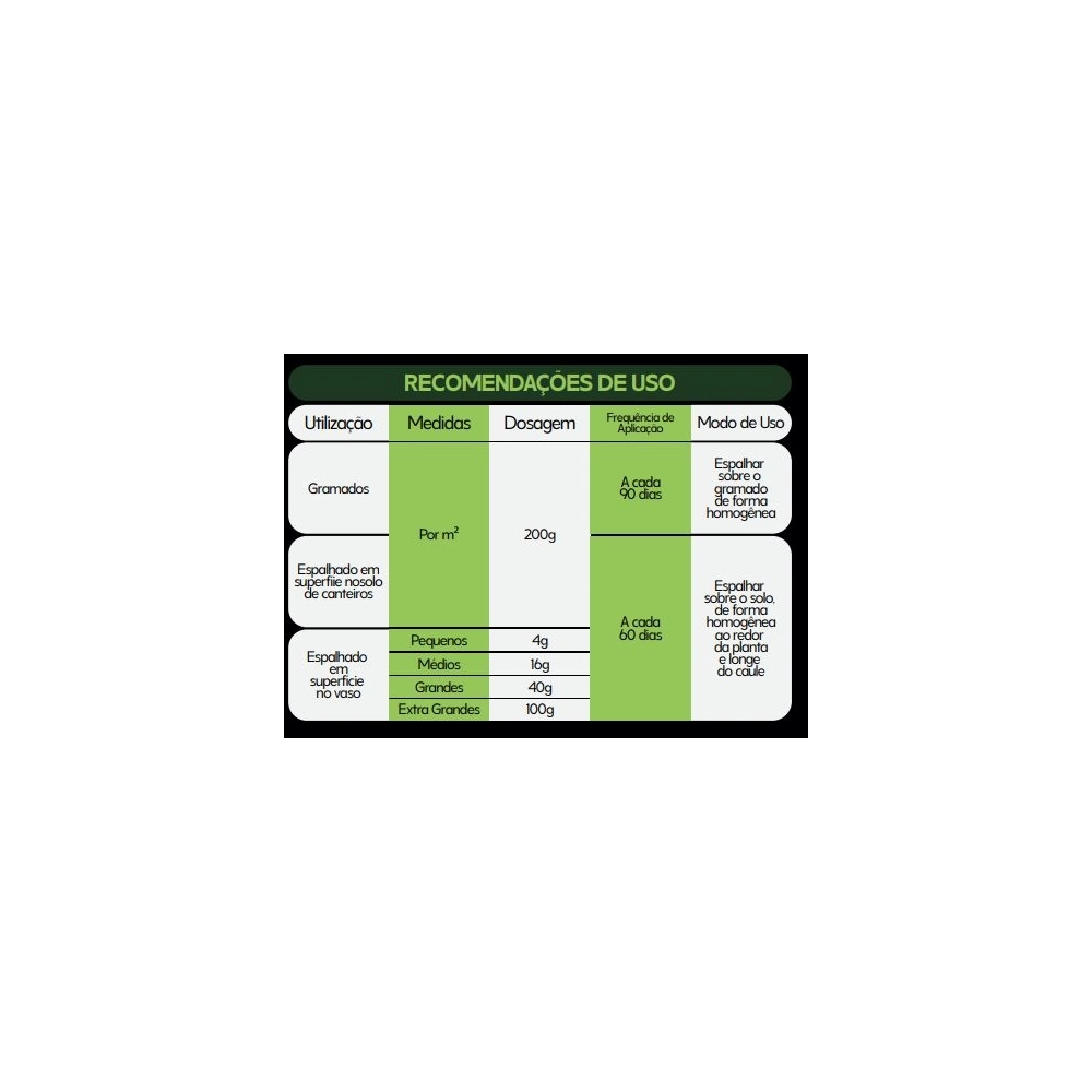 | Conteúdo nutricional | NPK + Macronutrientes Secundários + Micronutrientes + Carbôno Orgânico |